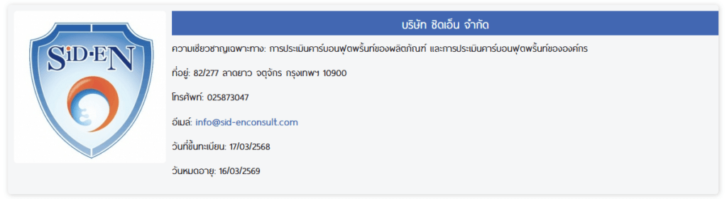 จัดทำรายงานการวิเคราะห์ผลกระทบสิ่งแวดล้อม (EIA)จัดทำรายงานการวิเคราะห์ผลกระทบสิ่งแวดล้อมเบื้องต้น (IEE)จัดทำรายงานการศึกษามาตรการป้องกันและแก้ไขผลกระทบสิ่งแวดล้อมและความปลอดภัย (ESA)จัดทำรายงานการติดตามตรวจสอบคุณภาพสิ่งแวดล้อม (Monitoring)ประเมินวัฏจักรชีวิตผลิตภัณฑ์ (Life Cycle Assessment : LCA)จัดทำคาร์บอนฟุตปริ้นท์ (Carbon Footprint)เพิ่มประสิทธิภาพการใช้น้ำในโรงงานอุตสาหกรรมหรืออาคารธุรกิจ โดยใช้หลักการ 1A3R (Avoid Reuse Recycle และ Reduce)ดูแลระบบบำบัดมลพิษโดยผู้ควบคุมที่เชี่ยวชาญระบบบำบัดมลพิษ, น้ำ และอากาศ บริษัท ซิดเอ็น จำกัด ได้รับการขึ้นทำเนียบที่ปรึกษา ในการจัดทำคาร์บอนฟุตพริ้นท์ของผลิตภัณฑ์กับองค์การบริหารจัดการก๊าซเรือนกระจก (องค์การมหาชน) ดังนี้ ประเภทนิติบุคคล